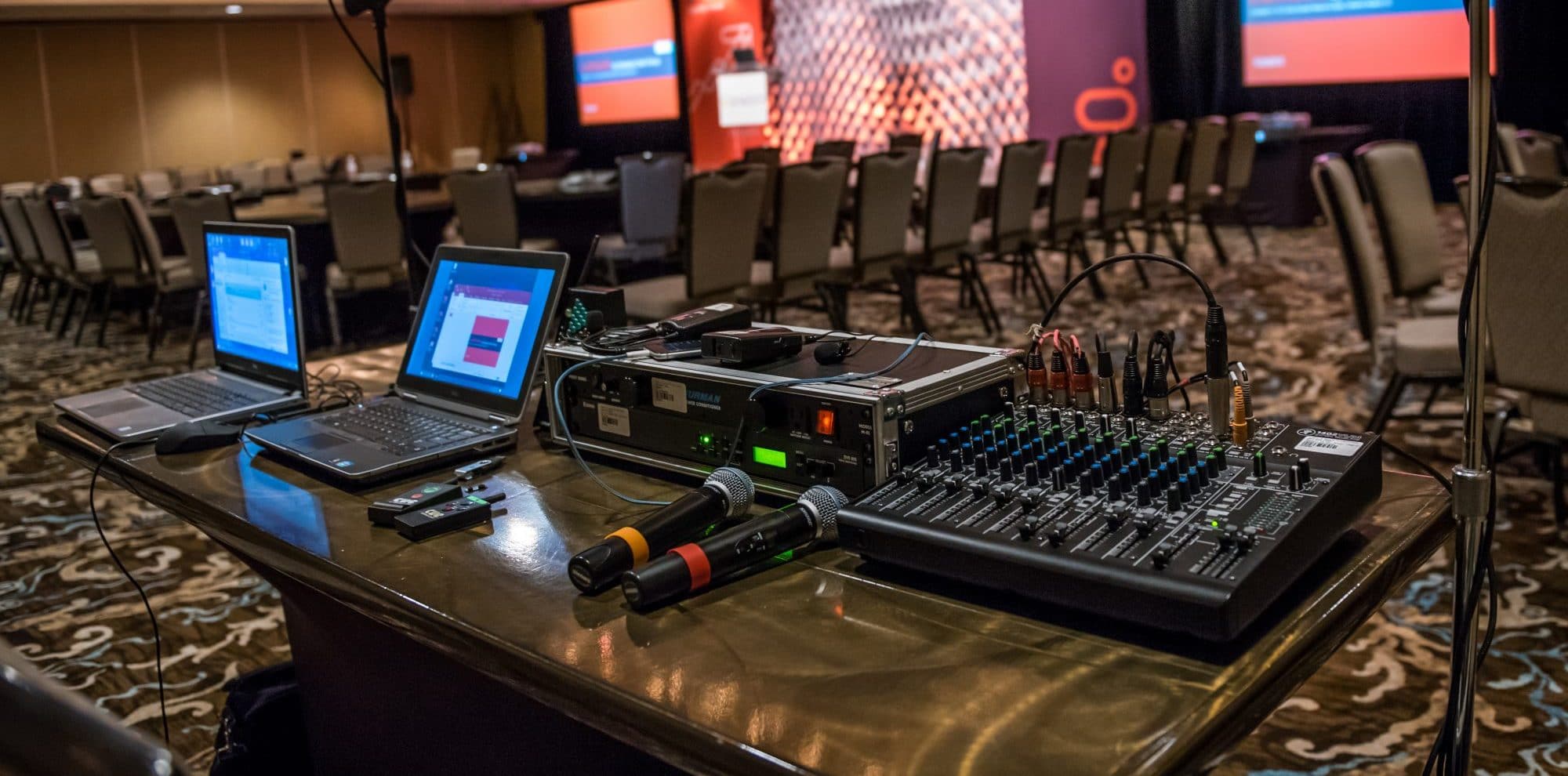 Will there be more than one microphone in use during the event? The soundboard/ audio mixer will be your go-to gear for the duration. Our technicians use the audio mixer to balance the varying sounds, control feedback and adjust microphone volume levels. On the technical side, these consoles manipulate and combine audio signals before routing them to your speakers. This is all just industry jargon to explain that the consoles take the sound from the microphone and route it to the speakers. To prepare your AV technicians, let them know how many presenters will be involved at the event.