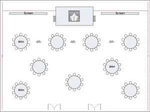 Staggered dining tables makes it easier to fit more attendees while still distancing each table by 6ft. With 8 seats at an 84-inch table, it allows you to seat guests who are from the same household or office together. This seating also allows the stage to be in view of all tables.