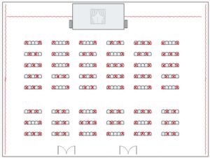 If your venue has theatre style seating, consider a pod seating layout By having designated chairs marked off, it lets you seat your guests who came together, in their own ‘pod’ of seats. This seating layout is also very customizable to your needs. Whether you want ‘pods’ of threes, every other row non-seated or only two seats per ‘pod’, it’s easy to switch it up.